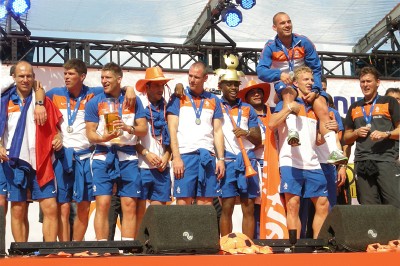 Volksfeest (13 juli) Hoewel Oranje net geen wereldkampioen wist te worden, werd het team op 13 juli toch groots onthaald in Amsterdam. Bij de rondvaart door de grachten en de huldiging op het Museumplein waren maar liefst 700.000 mensen aanwezig. Ook InterAxxie was namens de ING present om het volksfeest voor en achter de schermen fotografisch vast te leggen. Helaas mocht ik van de KNVB mijn eigen professionele apparatuur niet gebruiken. Dat recht is voorbehouden aan vier erkende KNVB-fotografen. Maar InterAxxie is niet voor een gat te vangen en dus togen we met een geleende compactcamera naar Amsterdam. De beeldkwaliteit is dus niet conform de InterAxxie-standaarden, maar de sfeerimpressie vergoedt veel. Bekijk hier de foto's! |